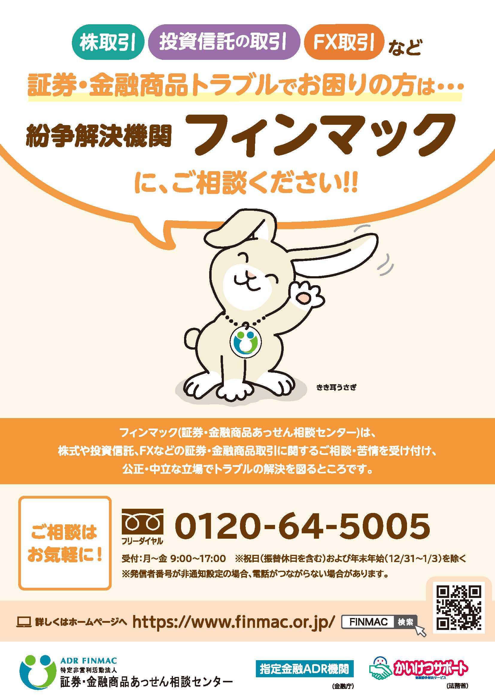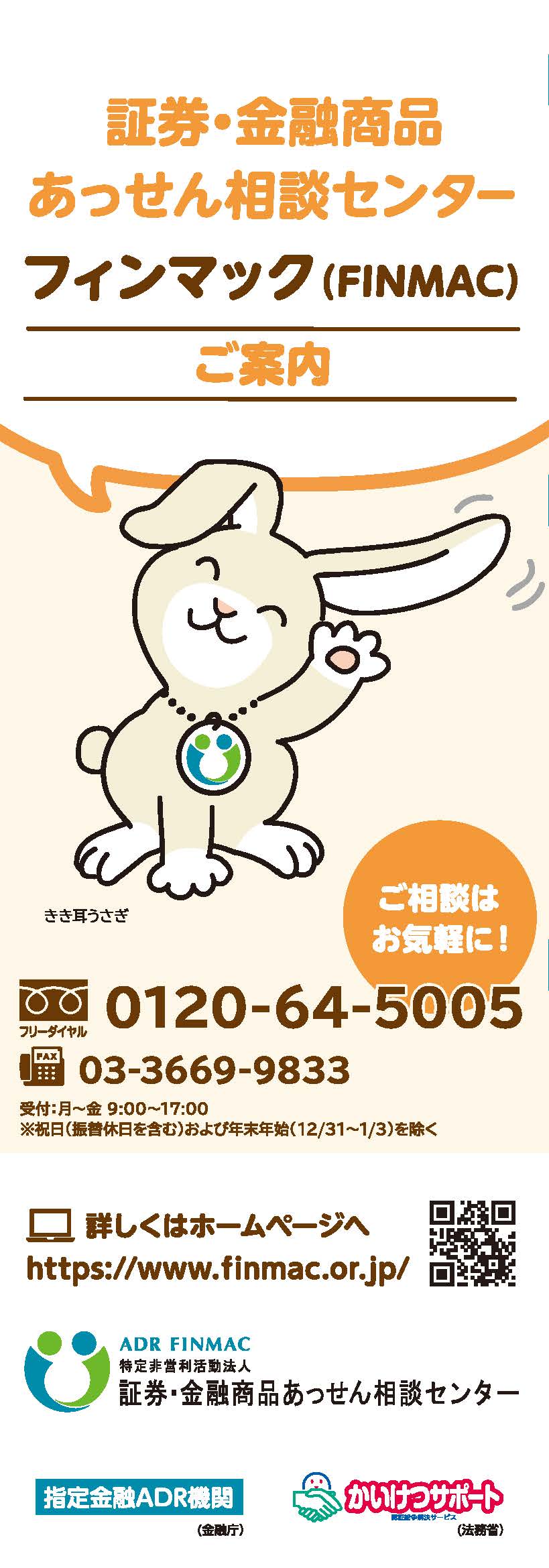 証券・金融商品あっせん相談センター(略称:FINMAC)では、当センターの普及・啓発のため、業務の概要等をとりまとめたポスター及びリーフレットを作成しております。ご活用ください。